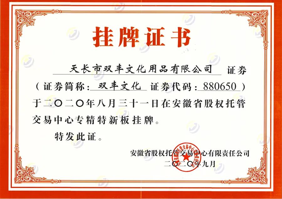 來自全省的109家“專精特新”企業成功登陸省“專精特新板”,雙豐公司也在其中,證券簡稱:雙豐文化,證券代碼:880650。